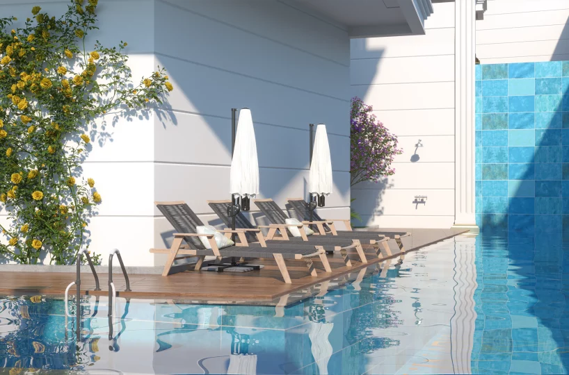 • Relaxation: Outdoor swimming pool surrounded by a landscaped green garden and sunbathing deck.
