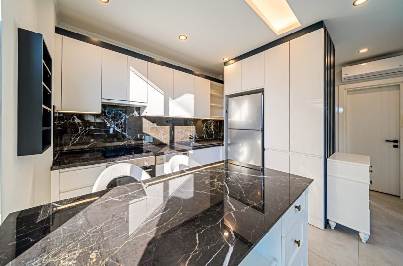 - Custom MDF lacquered kitchen cabinets with granite countertops and kitchen island.