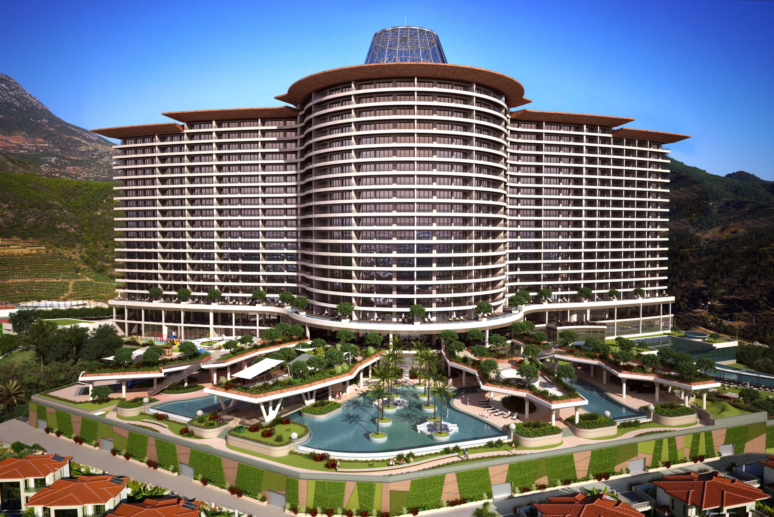 The project’s outdoor infrastructure is designed to cater to a large community, offering varied options for water activities and sports. The landscaping integrates these facilities into the natural environment of the complex.
