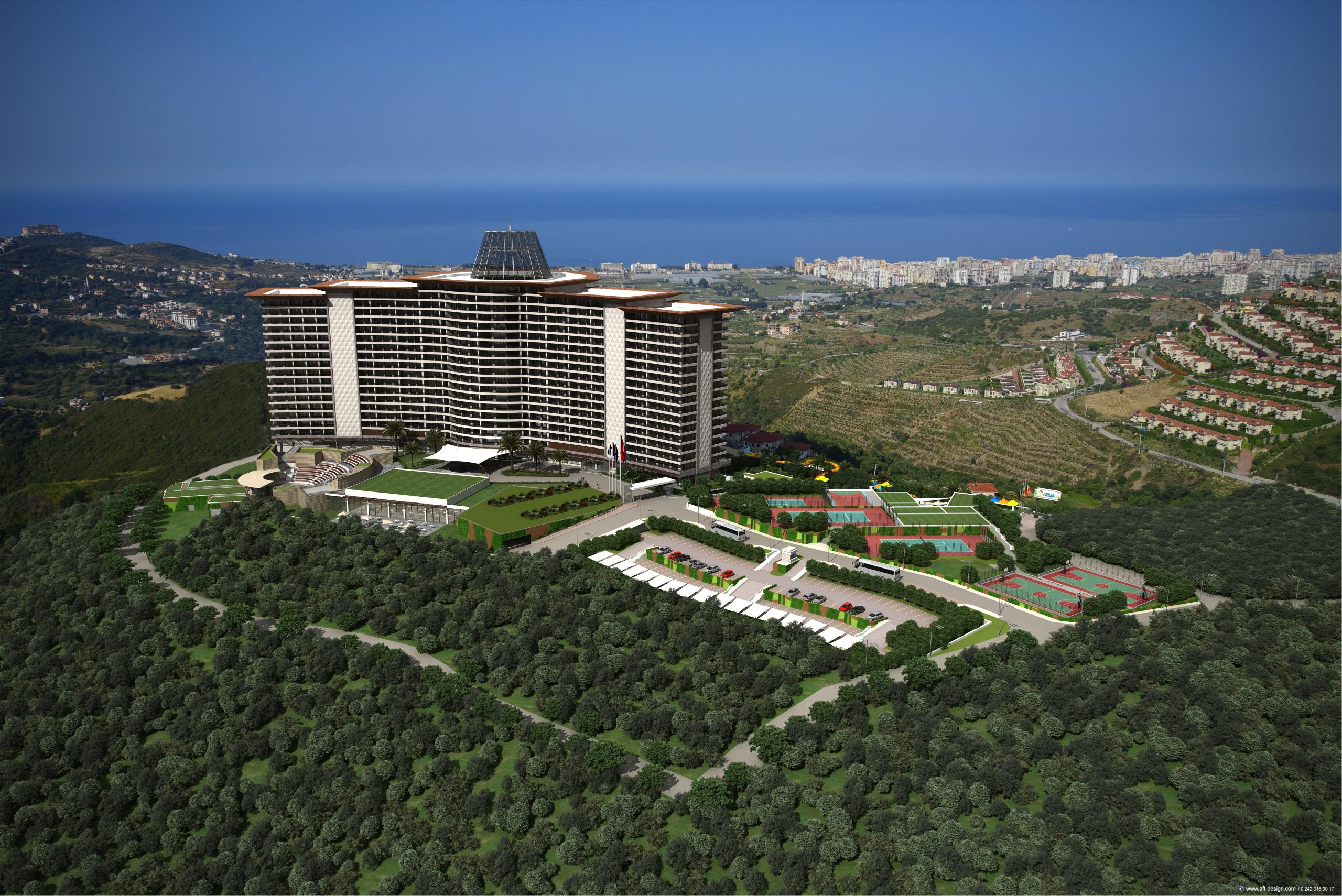 • Aquatic Facilities: The grounds include a large infinity pool, an aquapark, and a shaded children’s pool.