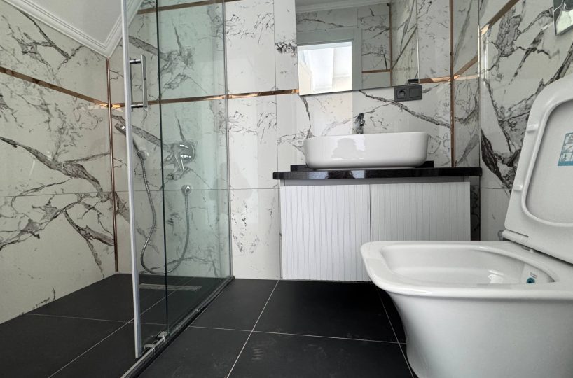 The property is positioned in Kestel, a developing area known for its low-rise architecture and proximity to the sea. The complex consists of two blocks and offers a modern living environment with easy access to the beach.