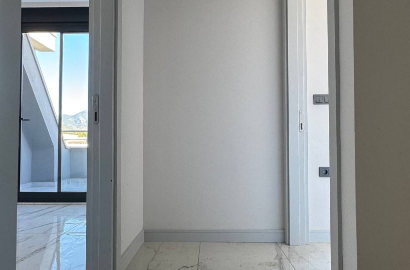 This 2+1 duplex penthouse offers a gross living space of 92 m² with a net usage area of 75 m². The interior is finished with high-standard materials, including lacquered cabinetry and insulated joinery, integrated with a smart home system for modern convenience.