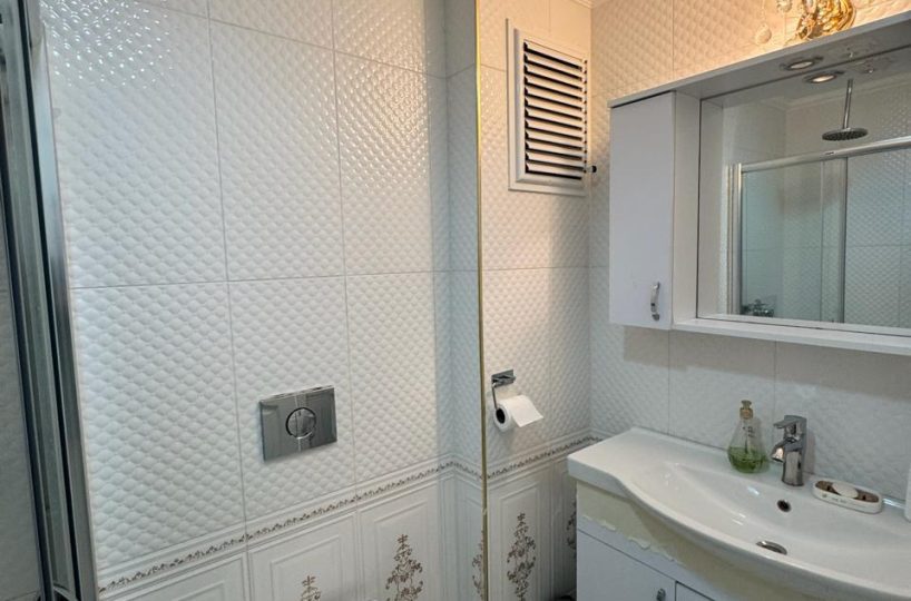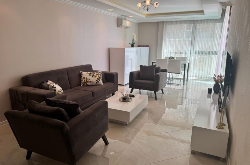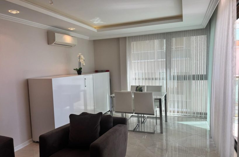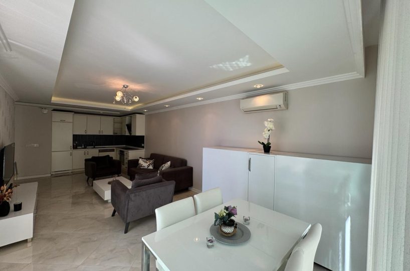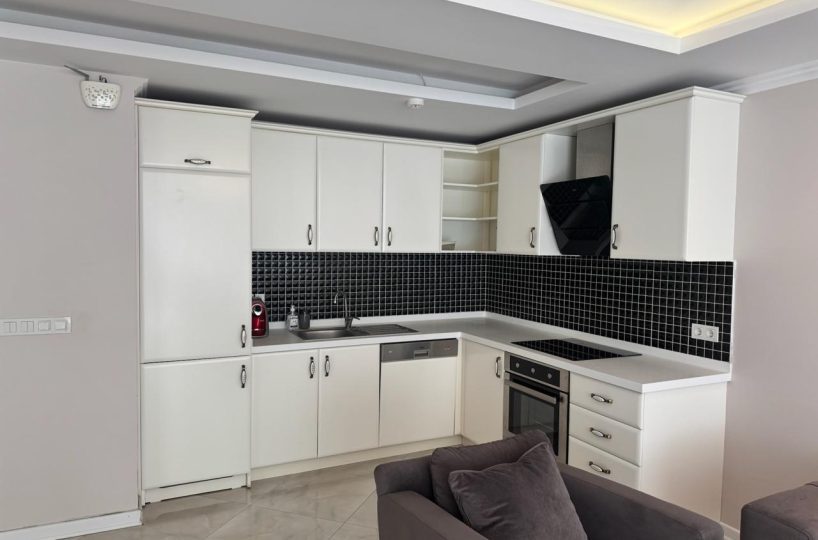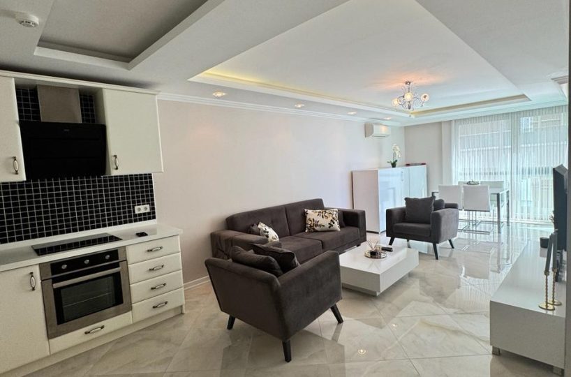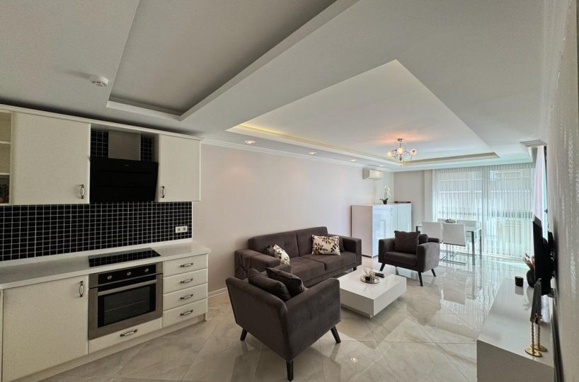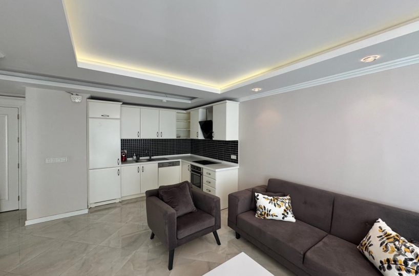 Situated on the 4th floor, this 1+1 apartment offers a generous 68m² of living space, which is significantly larger than standard one-bedroom units in the area. The apartment is offered fully furnished with modern furniture and appliances, ready for immediate move-in or rental. The layout is designed to maximize space and functionality, featuring a bright American-style kitchen and a comfortable living area that opens up to the coastal ambiance.