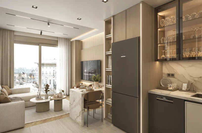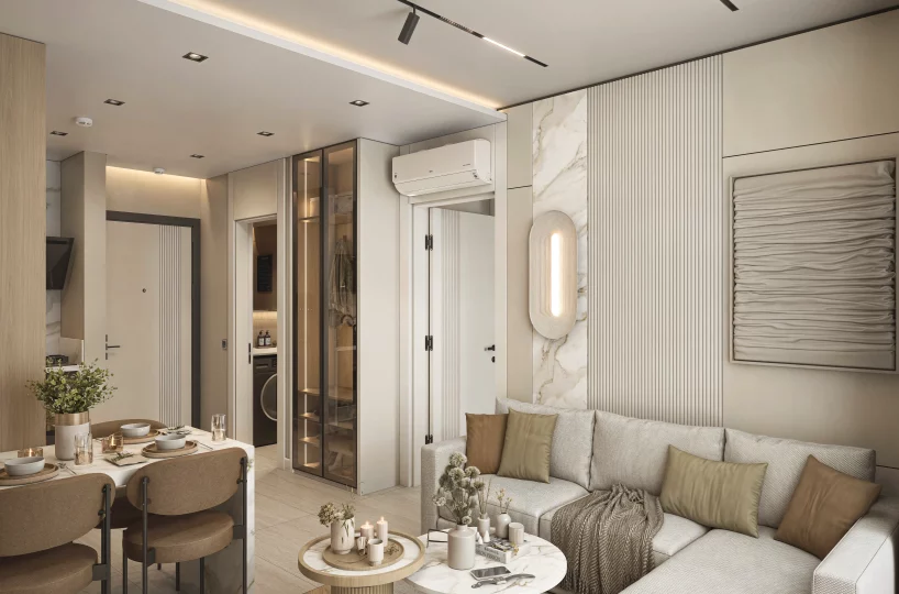 This 1+1 apartment features 33 m² of net living space, meticulously planned to maximize comfort and functionality. The interior design utilizes premium materials and the latest technology to ensure a seamless living experience.