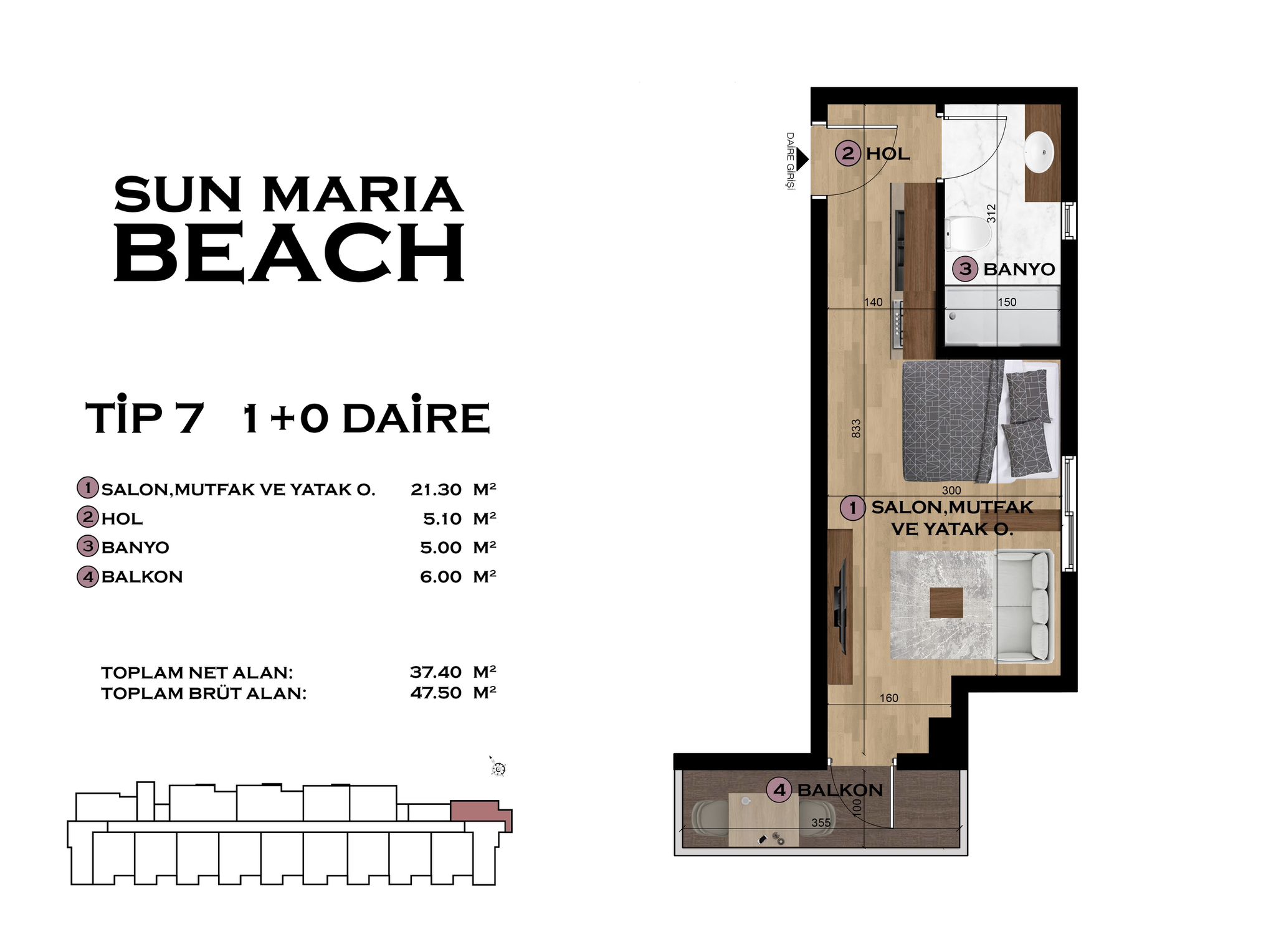 - Layout & Size: Efficient 31.5 m² net area with a 37.5 m² gross area including the balcony.