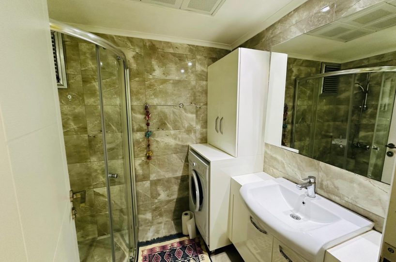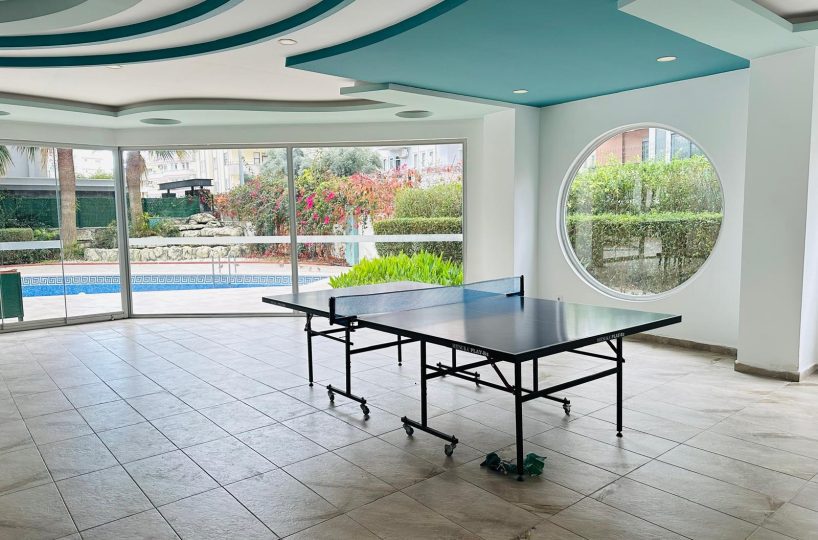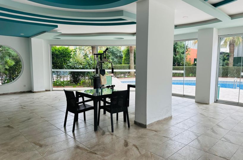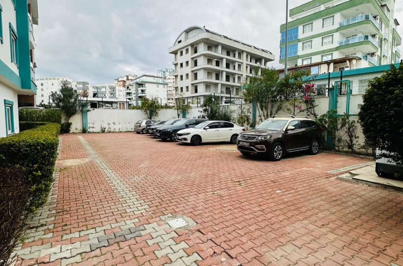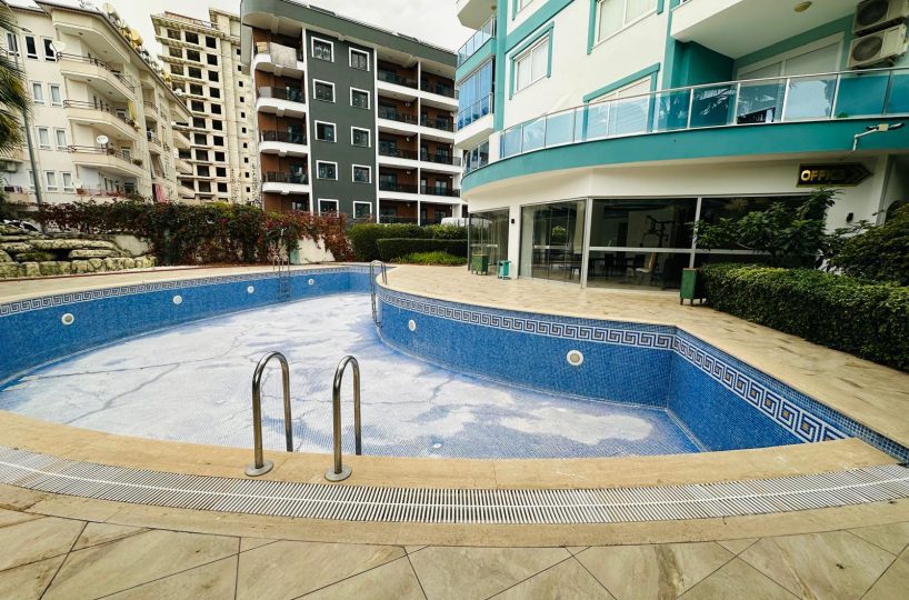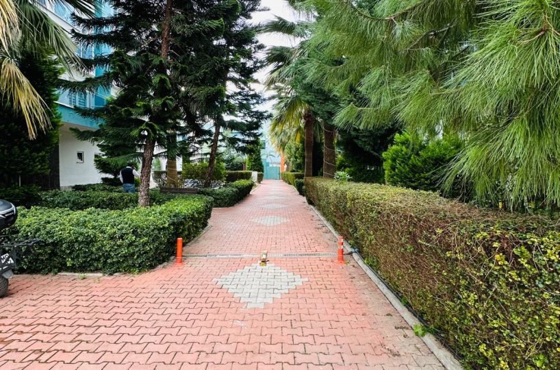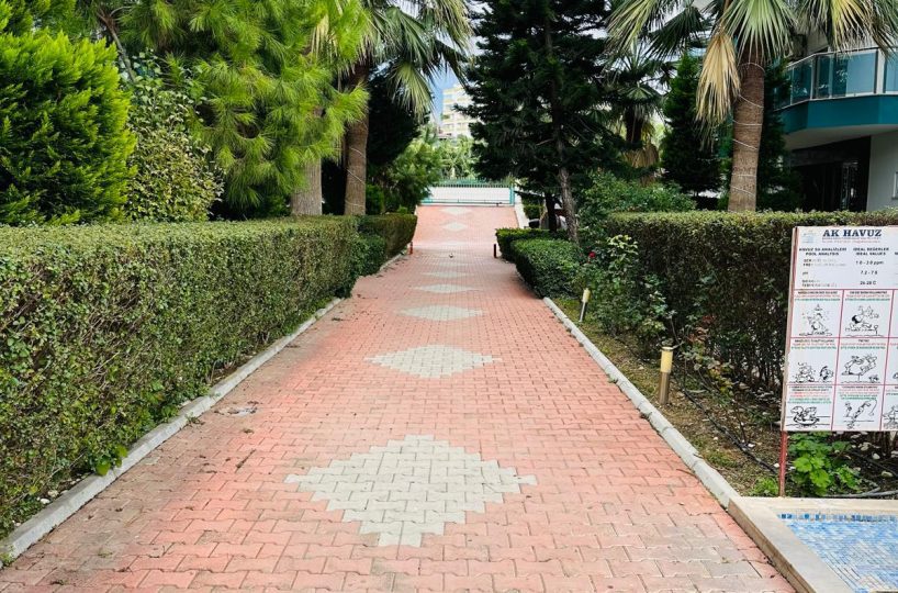 Kompleks, w którym znajduje się apartament, oferuje dostęp do zadbanego basenu otoczonego zielenią, gdzie można się zrelaksować w otoczeniu palm i kwiatów. Teren wokół budynku jest estetyczny, z brukowanymi alejkami i miejscami do odpoczynku na świeżym powietrzu. Lokalizacja jest doskonała – zaledwie 500 metrów od kamienistych plaż Morza Śródziemnego, w otoczeniu sklepów, restauracji i tętniącego życiem Mahmutlar.