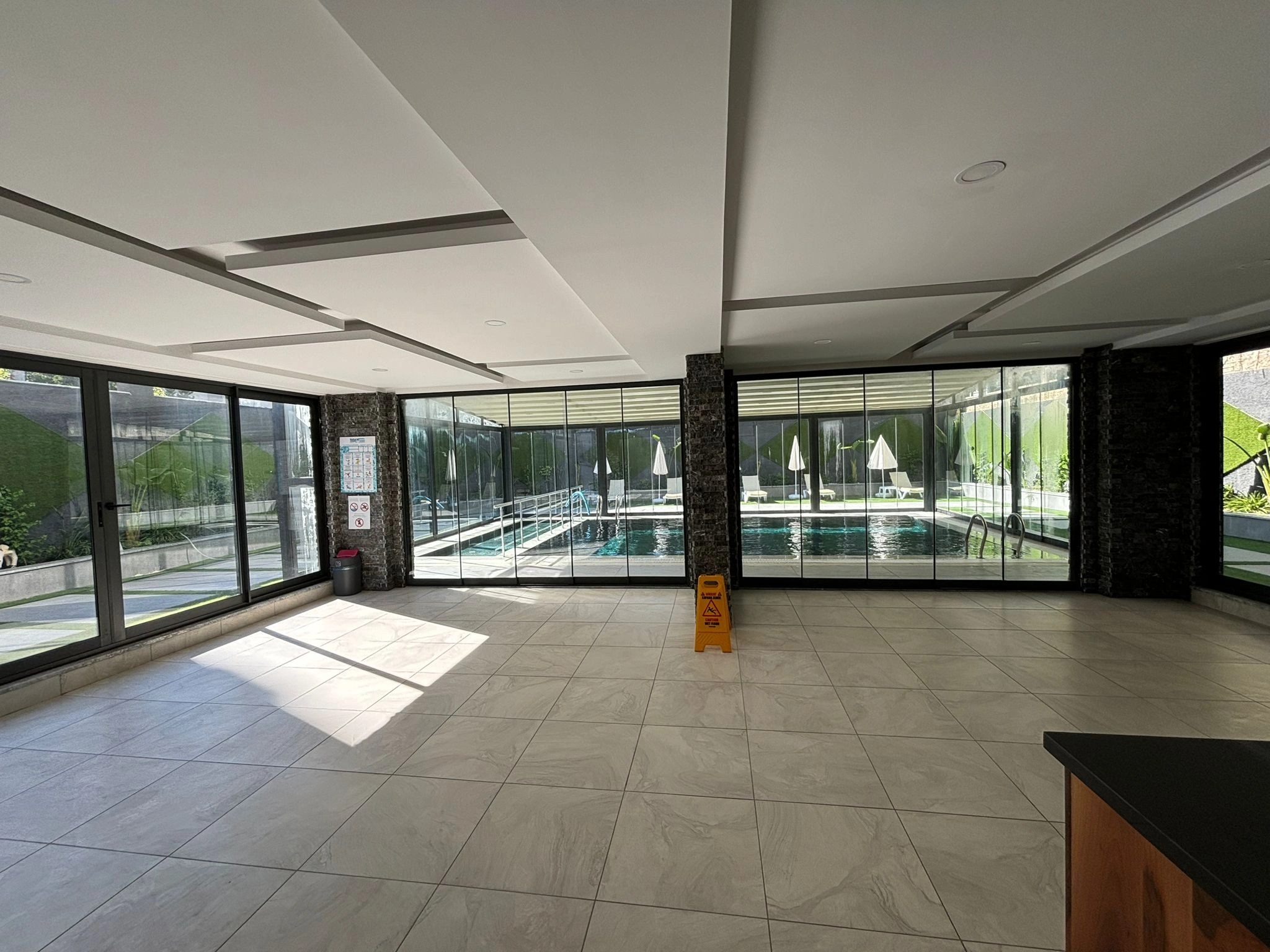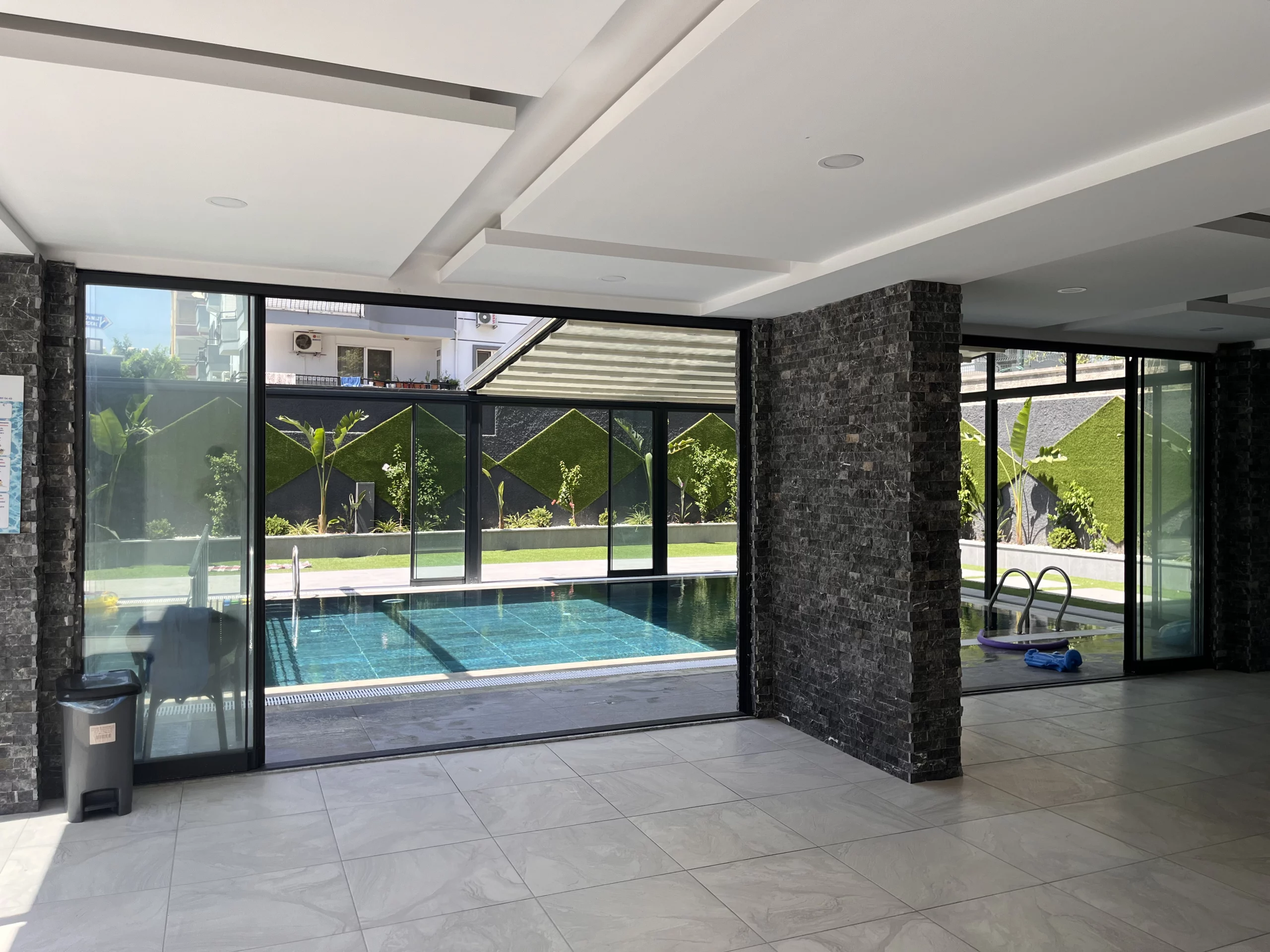 • Baseny: Duży basen zewnętrzny na letnie dni oraz podgrzewany basen wewnętrzny na miesiące zimowe.